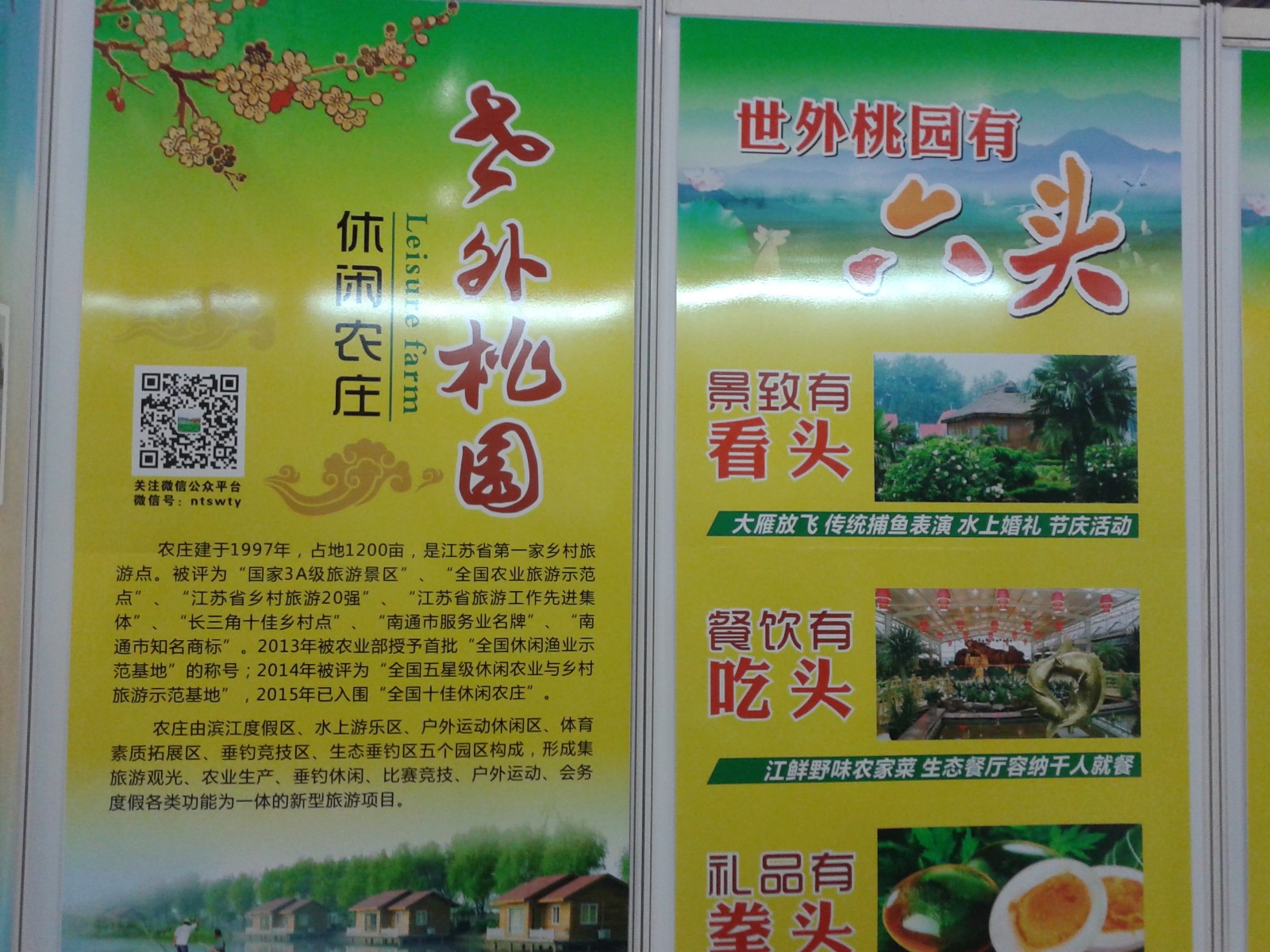 世外桃園休閑農(nóng)莊位于南通市南郊,坐落于長江邊,距蘇通大橋6公里,距南通市區(qū)15公里,交通便捷。本農(nóng)莊創(chuàng)建于1997年3月,占地1200畝,總投資1.2億元,農(nóng)莊開發(fā)利用長江灘涂,營造返璞歸真、風格各異的建筑群體和人與自然和諧生態(tài)景觀。多層次、多角度地展現(xiàn)綠色田園風光和農(nóng)家生活環(huán)境,為旅客營造親切自然地田園休閑氛圍。