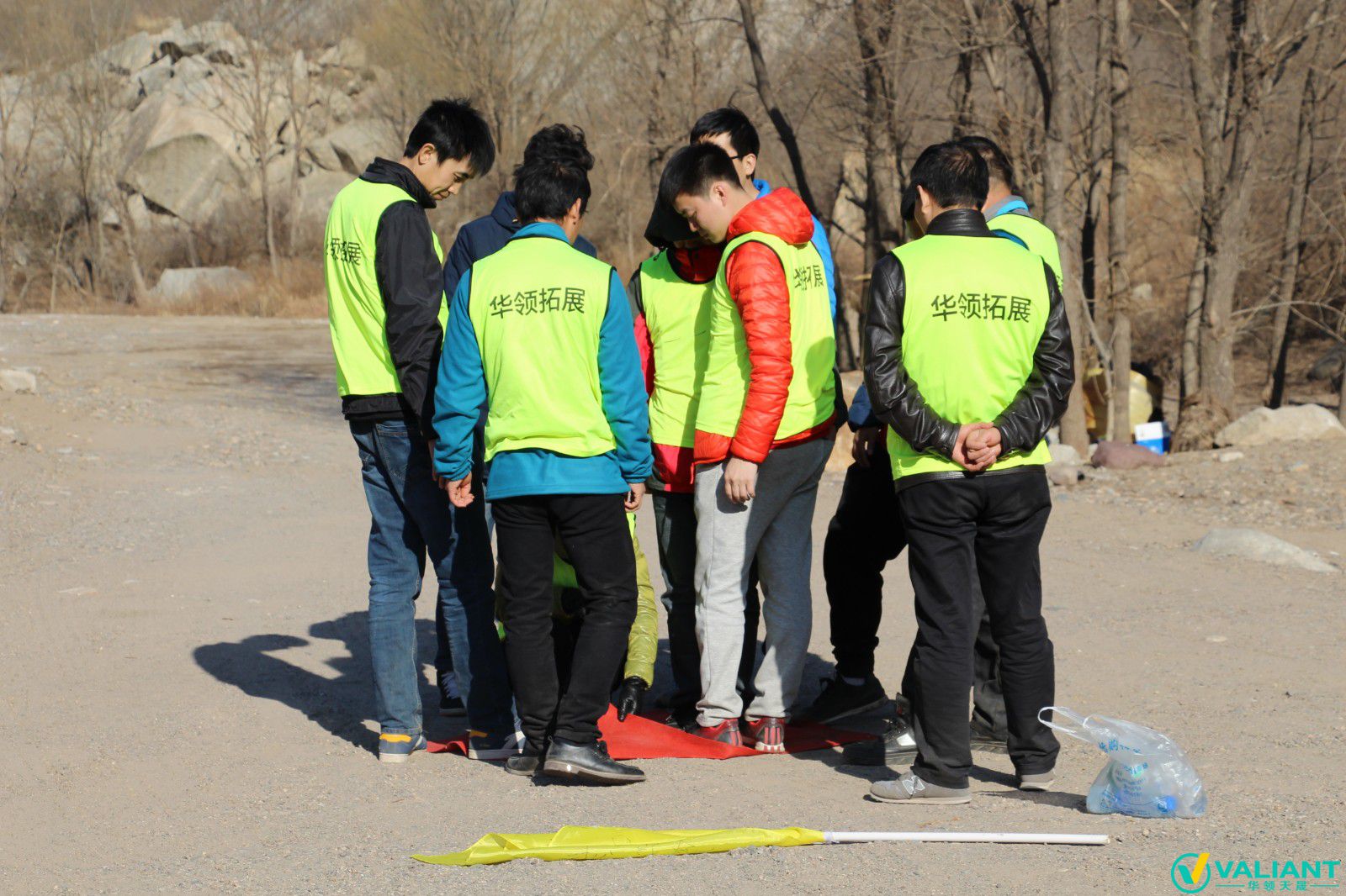 這是一個(gè)團(tuán)隊(duì)合作項(xiàng)目。要求學(xué)員在規(guī)則約束下,盡快將毯子翻過(guò)來(lái),直至所有人站在毯子的另一面為止。全體隊(duì)員一起做為佳,如果人數(shù)較多,可分組比賽。